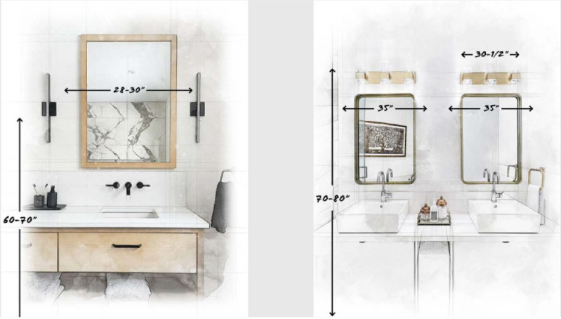 When placing vanity lighting above your bathroom mirrors, be sure to choose lighting that is at least 3"-5" smaller than the width of your mirror. Lighting should be at least 70-80" from the floor.